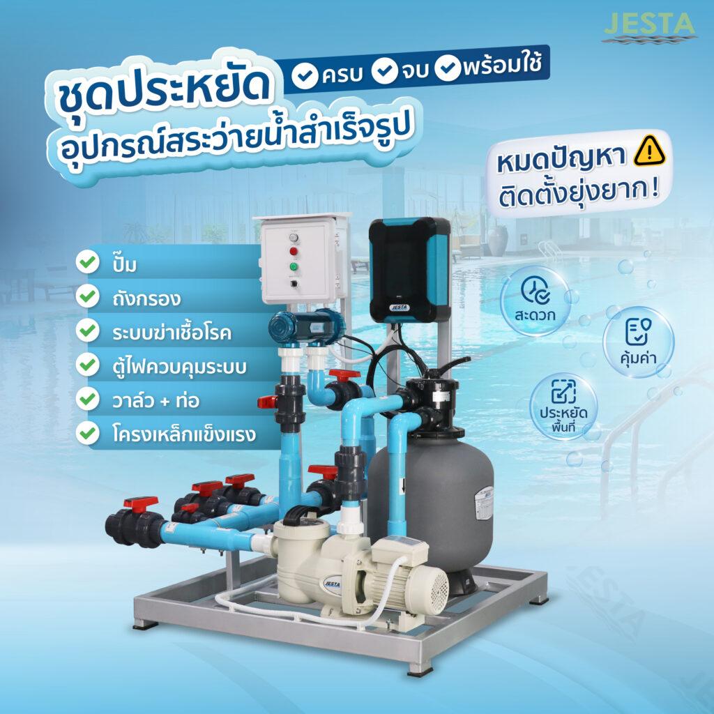 Complete Set Jesta คือชุดอุปกรณ์สระว่ายน้ำที่ผ่านการออกแบบระบบโดยผู้เชี่ยวชาญเพื่อให้ทุกอุปกรณ์สามารถทำงานร่วมกันได้อย่างเต็มประสิทธิภาพ ลดปัญหาการเลือกอุปกรณ์ไม่ตรงสเปก และช่วยให้สระว่ายน้ำพร้อมใช้งานได้ทันทีหลังติดตั้ง